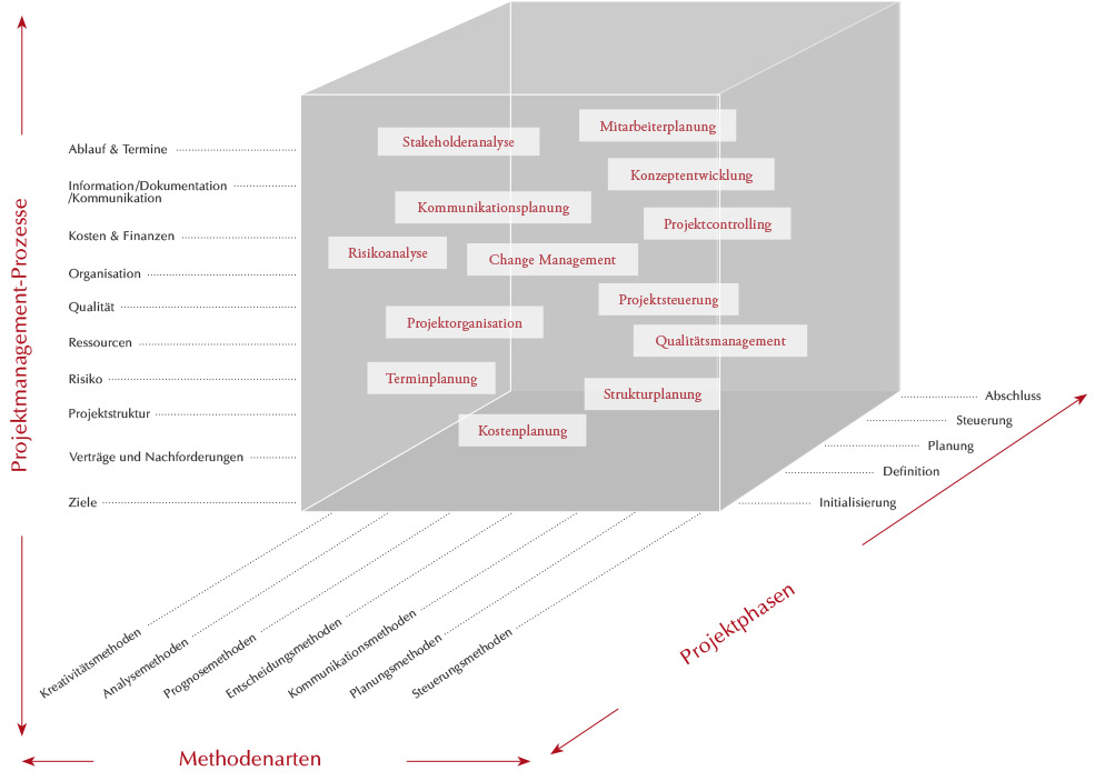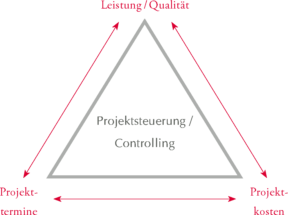 Dieses Gesamtkonzept ermöglicht es, außerordentliche und komplexe Vorhaben sicher zu steuern und professionell zum Erfolg zu führen. Bei jedem Projekt besteht ein Spannungsdreieck zwischen Qualität, Kosten (Ressourcen) und Projektterminen (Zeit).